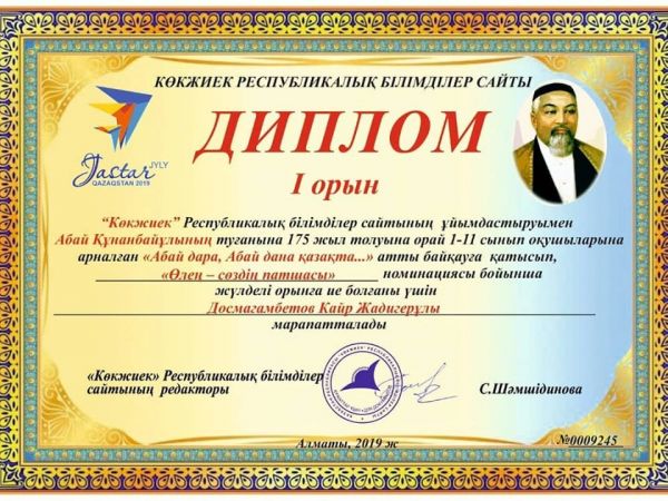 "Көкжиек " Республикалық білімділер сайтының ұйымдастыруымен Абай Құнанбайұлының 175жыл толуына орай 1-11 сынып оқушыларына арналған "Абай дара, Абай дана қазақта...."атты байқау…
