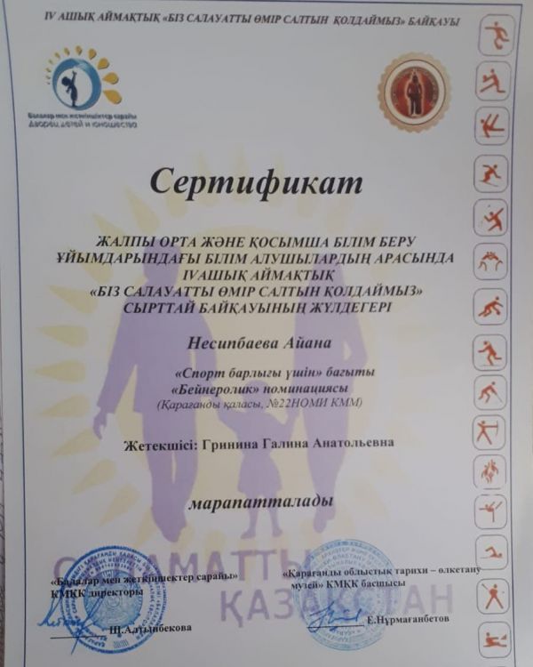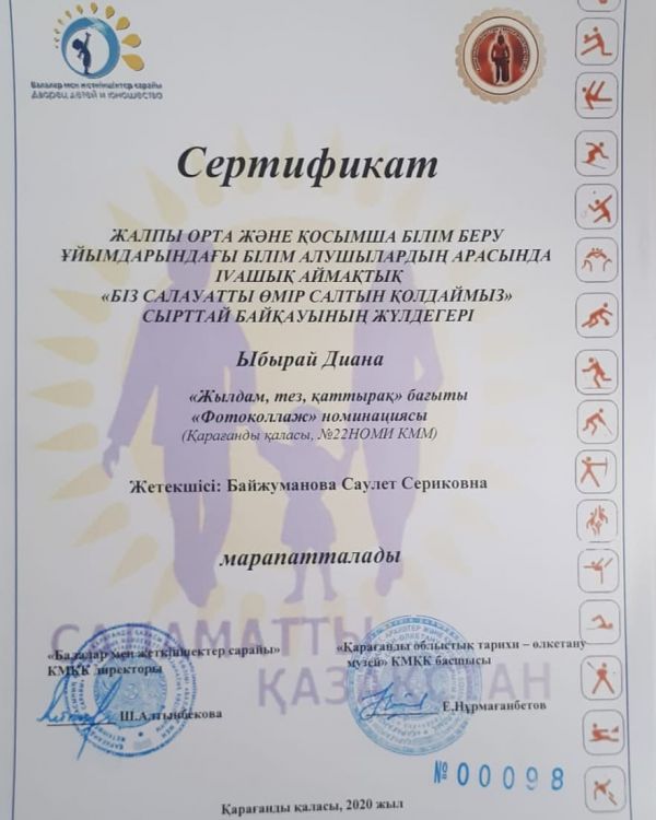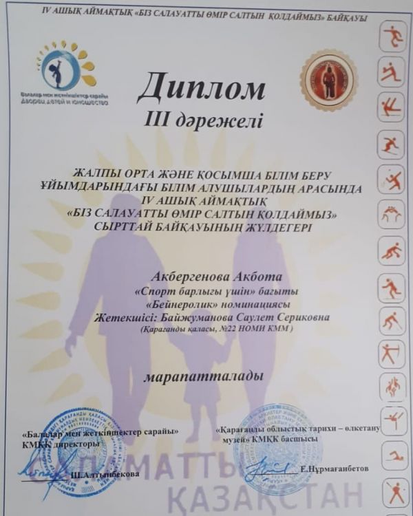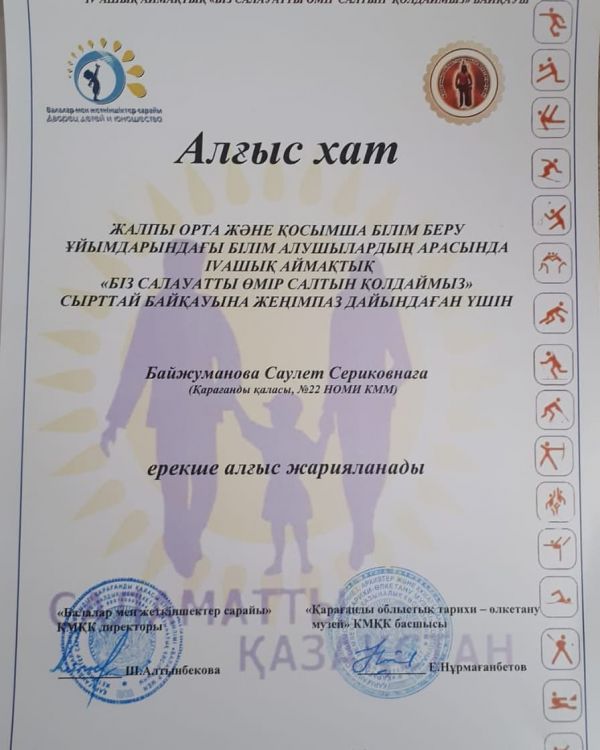 ОБЪЯВЛЕНА БЛАГОДАРНОСТЬ БАЙЖУМАНОВОЙ САУЛЕТ СЕРИКОВНЕ ЗА ПОДГОТОВКУ ПОБЕДИТЕЛЯ ЗАОЧНОГО КОНКУРСА "МЫ ЗА ЗДОРОВЫЙ ОБРАЗ ЖИЗНИ", ПОЗДРАВЛЯЕМ!