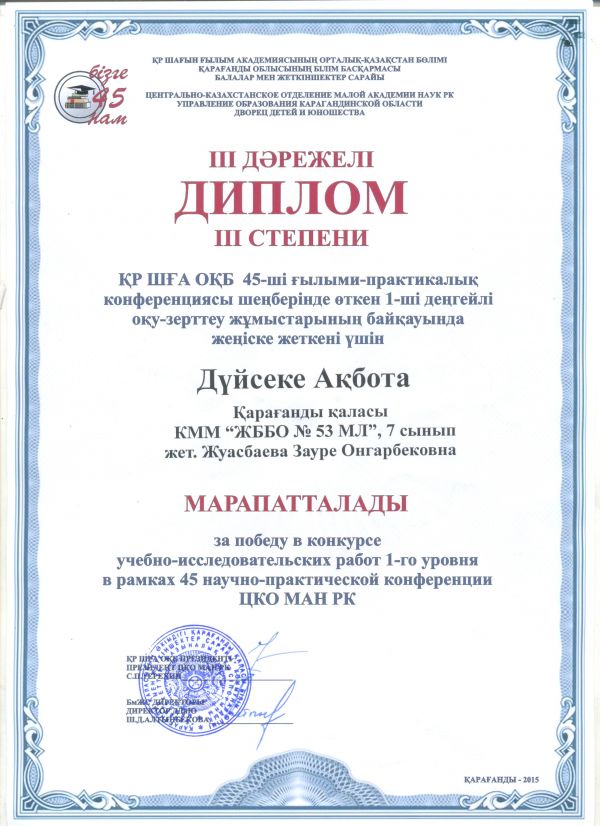 7 «А» сынып оқушысы Дүйсеке Ақбота ІІІ дәрежелі дипломға ие болды.