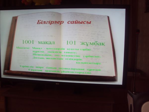 Бұл күні балалар таңғы астан соң «1001 мақал,101 жұмбақ» тақырыбындағы білгірлер сайысына қатынасты. Сайысты өткізудегі…