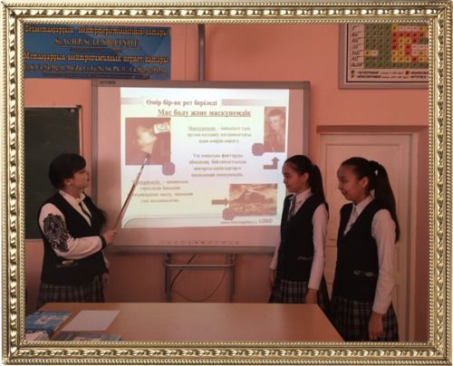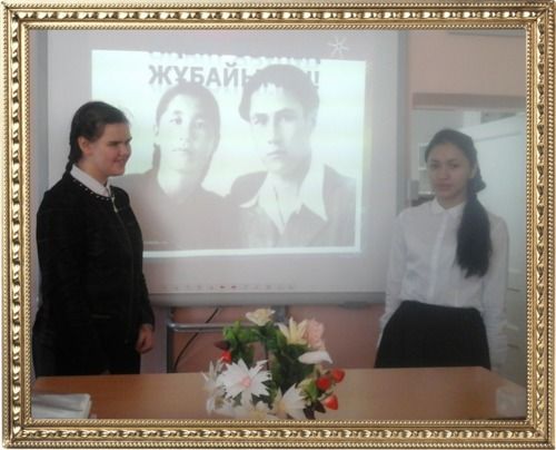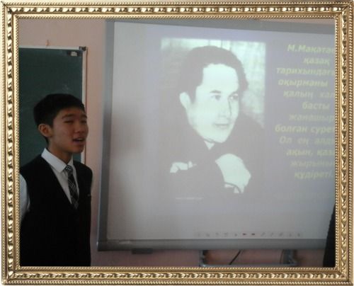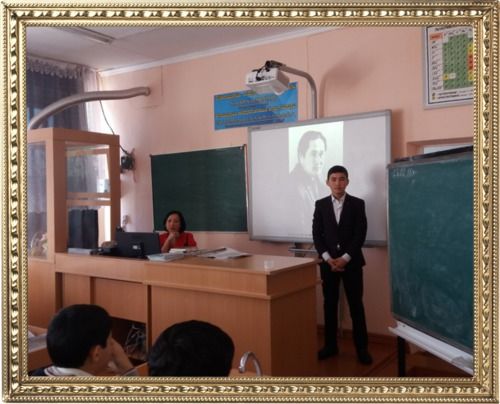 Біздің кітапханада.         Мұқағали  Мақатаевтың  «Өлең – бұл жан дүниенің ашылуы» атты  9 «А» мен  9 &la…