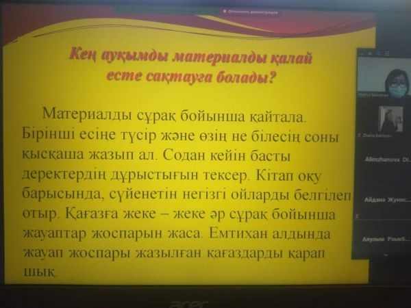 Мектептің педагог-психологы Н.Б.Бакированың ұйымдастыруымен 11 сынып оқушыларына "ҰБТ-ға қалай дайындалу керек" тақырыбында психологиялық сабақты Зуум форматында вебинар өткізді.