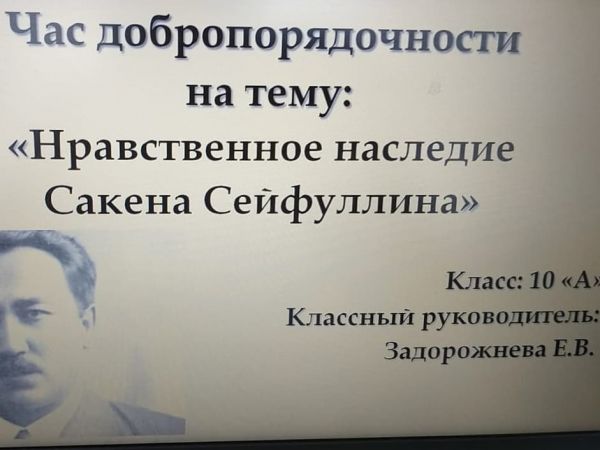 23.12.2020г., в рамках проведения «Часа добропорядочности» был проведён классный час для учащихся 6"В" класса ,показана презентация и видеоролик о Сакене Сейфуллине. К…
