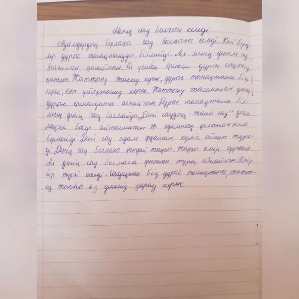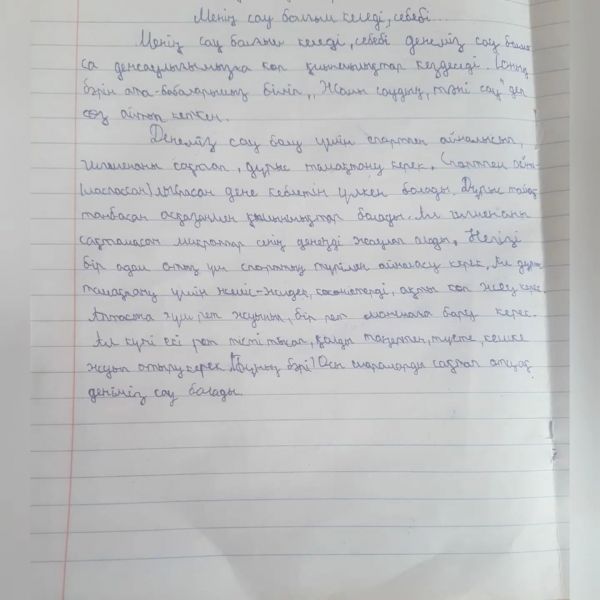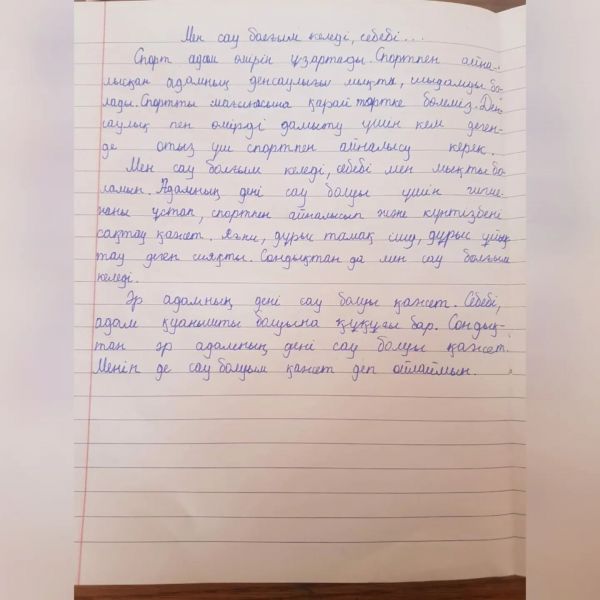 "Денің сау болса, бәрін аласың" дене шынықтыру апталығы аясында 4"А" сынып оқушыларының "Менің сау болғым келеді, себебі...". тақырыбында жазған эссе. Сынып жетекшісі:…