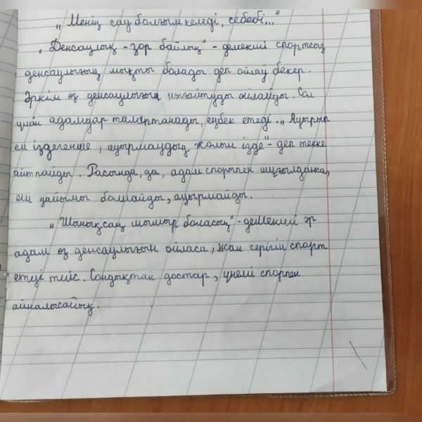 4-"Б"сынып оқушыларының Денешынықтыру апталығы барысында жазған "Менің сау болғым келеді, себебі... " атты эссе байқауынан. Сын. жет-сі: У. З. Шымболова