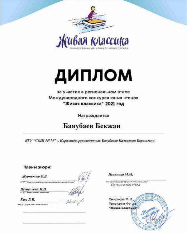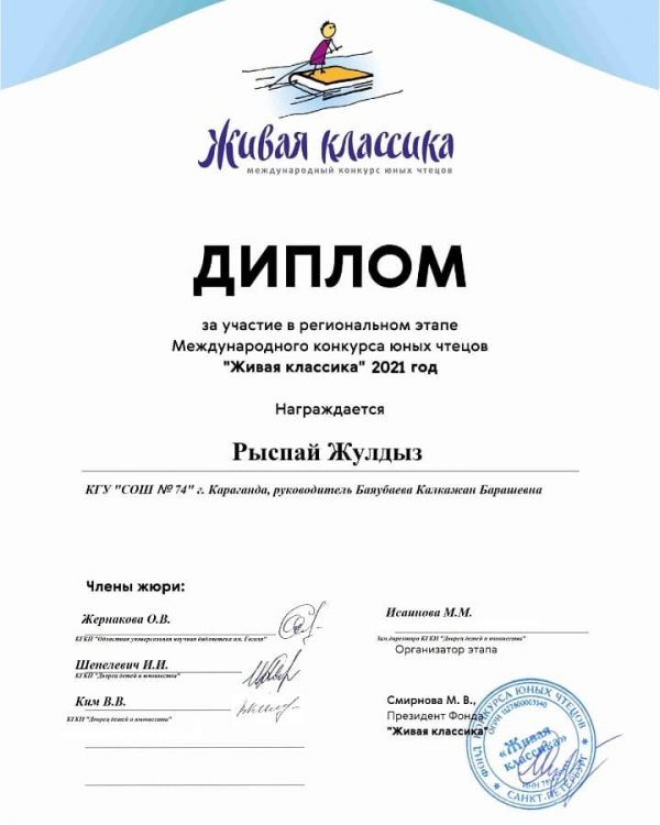 Поздравляем учеников Рыспай Жулдыз, Булдакова Мария, Баяубаев Бекжан, Рахимберлина Дильназ с Дипломом Регионального этапа Международного конкурса"Живая классика". Желаем вам творч…