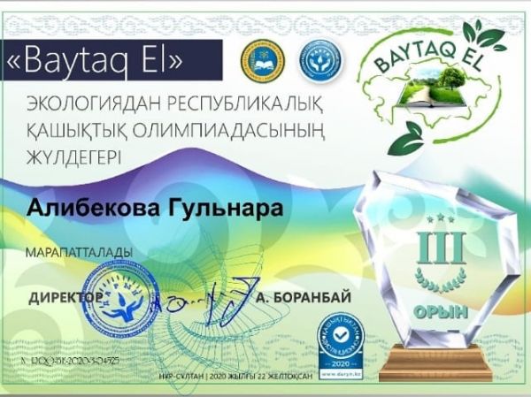 Экологиялық республикалық қашықтық олимпиасының II орын жүлдегері химия пәні мұғалімі Алибекова Гульнара Асанбековна