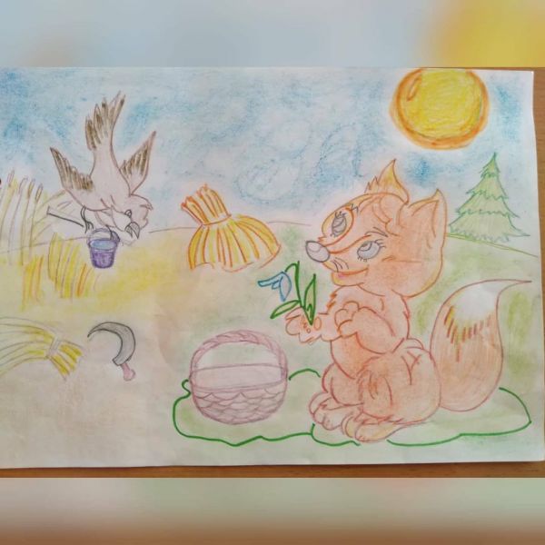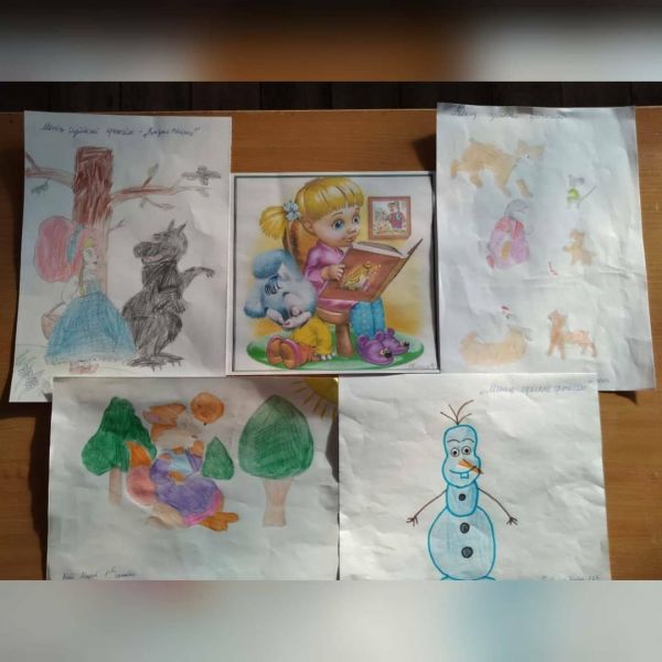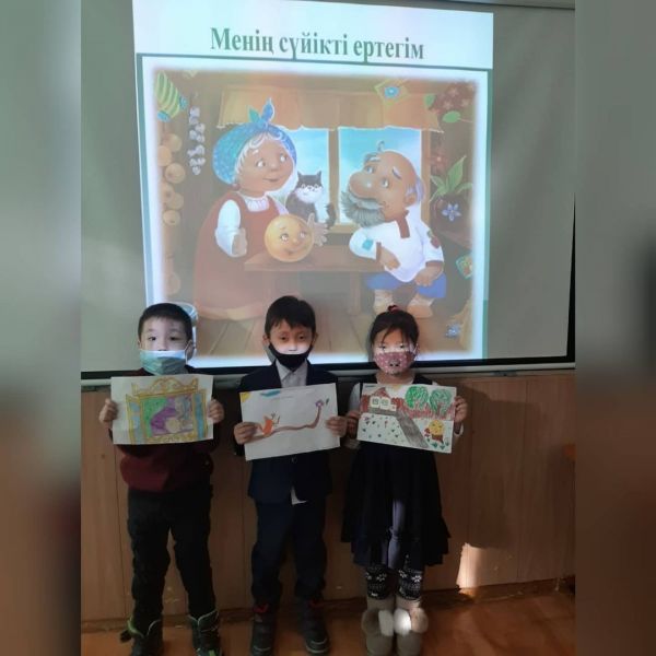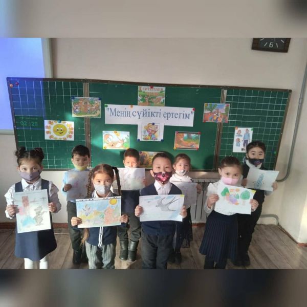 Оқу сауатылығы апталығы аясында 1"Б" сынып оқушыларының "Менің сүйікті ертегім" тақырыбы бойынша сурет көрмесі.