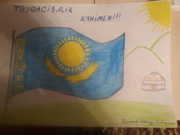 3-"Б"сынып оқушыларының "Менің Отаным-Қазақстан"тақырыбына салған суреттер көрмесінен Сынып жетекшісі У.З.Шымболова