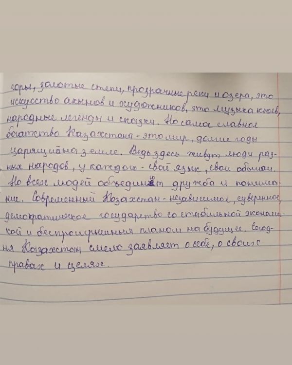В преддверии празднования Дня Независимости Р.К. ученица 7 "В" класса - Кончеганова Сабина написала сочинение на тему: "Моя Родина - Независимый Казахстан".