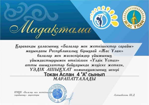 "Үздік ұстаз" атты ашықхаттар байқауында жеңіске жеткен, Үздік Ашықхат номинациясының иегерлері 4"А"сынып оқушылары Каиржанов Нурхан, Хамзина Самира, Мұрат Зере, Токан Аслан, Өмі…