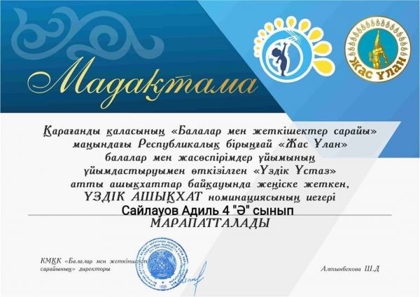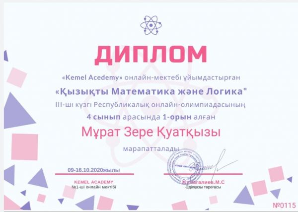 "Қызықты Математика және Логика" lll-ші күзгі Республикалық онлайн-олимпиадасына қатысып, 4"А" сынып оқушысы Мұрат Зере 1 орынды иеленіп Дипломмен марапатталды. Сынып жетекшісі:…