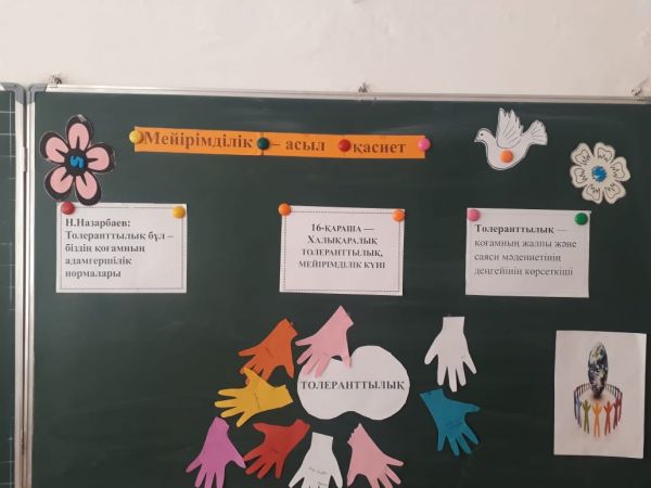 2"Ә" сыныбында 16 қараша - Халықаралық толеранттылық,мейірімділік күніне "Мейірімділік -асыл қасиет" тақырыбында сынып сағаты өтті.Онда ойларын айтып,мейірімділік қасиеттерін жаз…