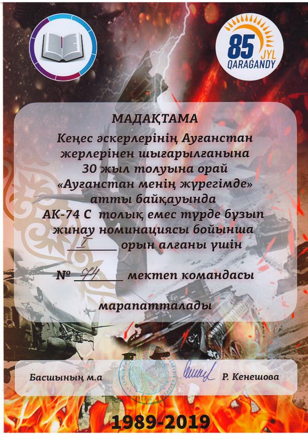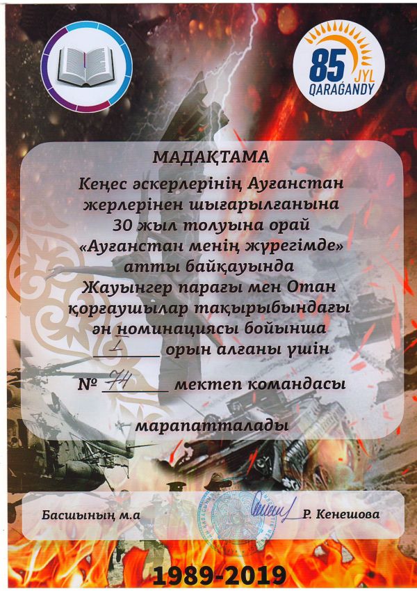 2019 жыл 25 ақапн күні біздің мектеп аясында Қарағандының 85 жылдық мерей тойын мерекелеу шеңберінде Кеңес әскерлерінің Ауғаныстан жерлерінен ш…
