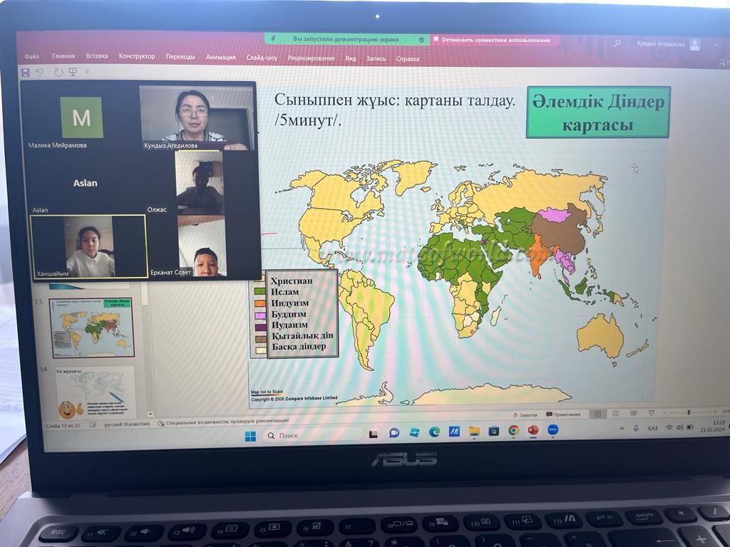 21.02.2024 География пәнінен 7 А, Ә сыныптарында “Дүниежүзі халқының діни құрамы” тақырыбында сабақ қашықтықтан ZOOM платформасында өтті.