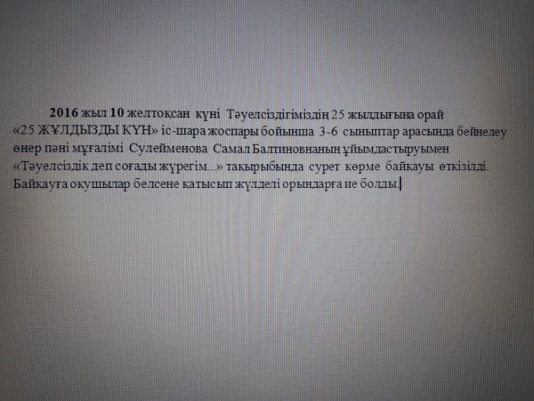 2016 жыл 10 желтоқсан күні Тәуелсіздігіміздің 25 жылдығына орай «25 Жұлдызды күн» іс-шара жоспары бойынша 3-6 сыныптар арасында бейнелеу өнер пәні мұғалімі Сулейменова Самал Балтиновнаны…