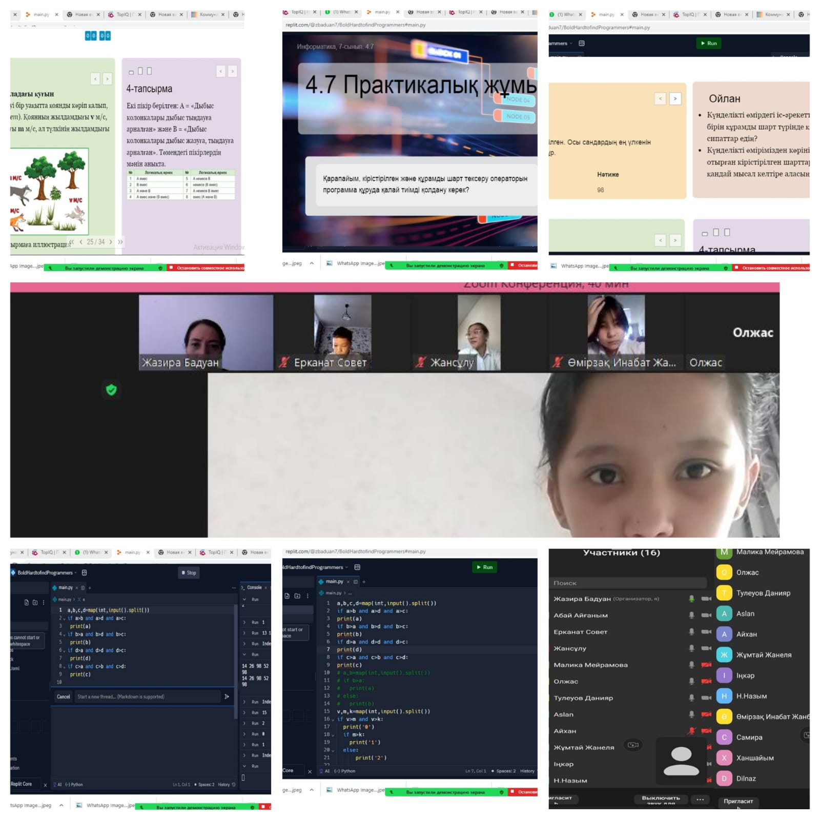 20.02.2024ж. 7 "А" сыныбында ZOOM платформасында "Практикалық жұмыс. "Python программалау тіліндегі күрделі шарттарды қолдану" тақырыбында онлайн сабақ өтті. Пән…