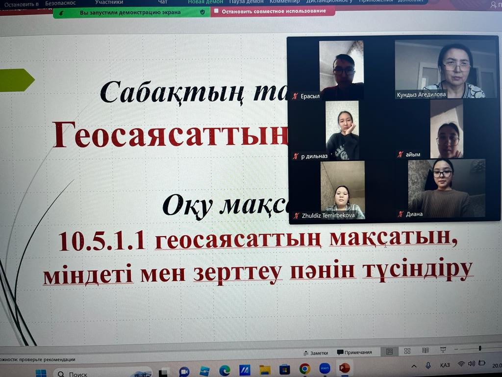 20.02.2024ж. География пәнінен 11 А сыныбында “Қазақстанның геосаяси жағдайы” тақырыбында сабақ қашықтықтан ZOOM платформасында өтті.