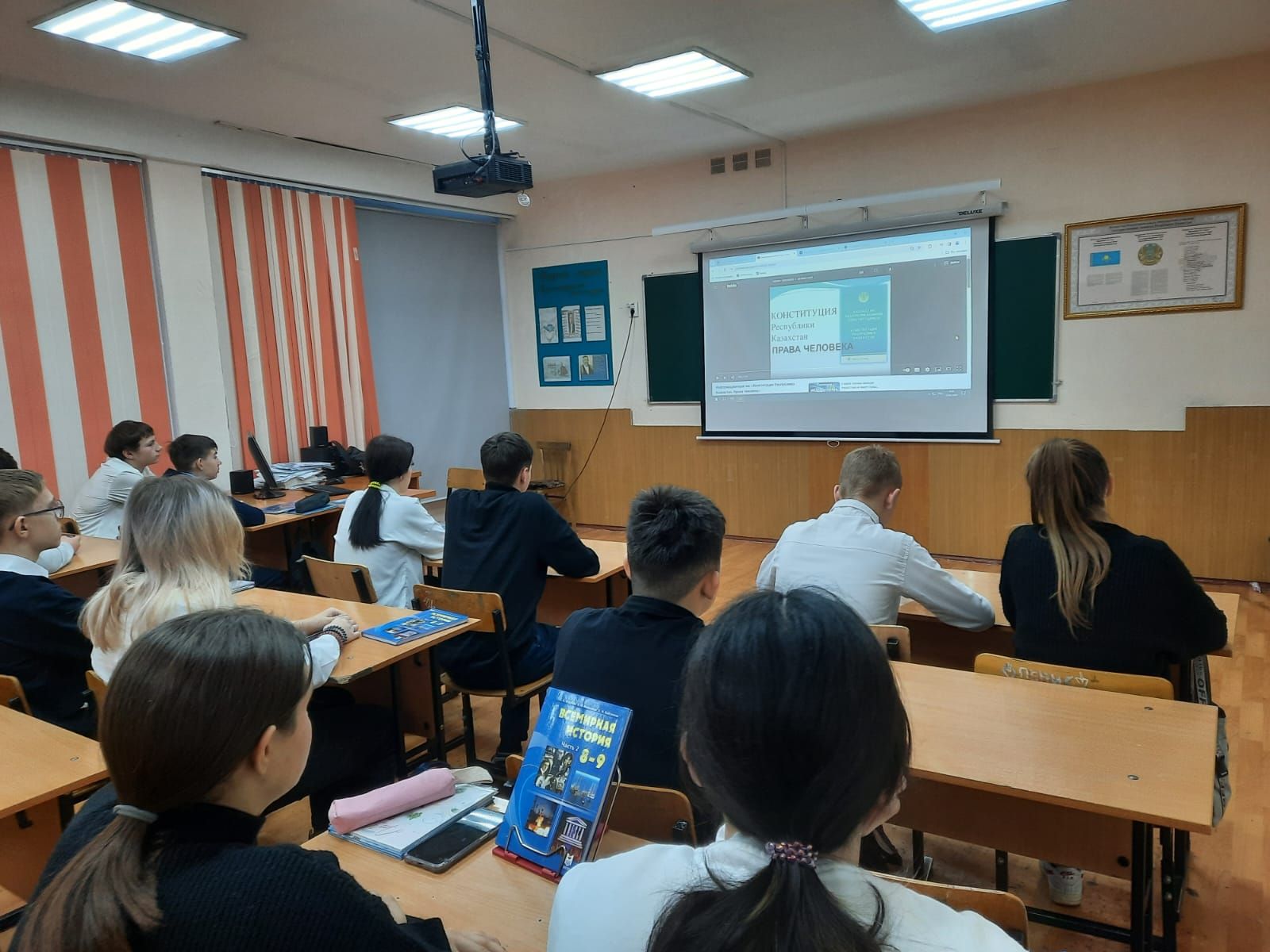 16.02.2024ж. в рамках недели Правовой грамотности "Правовой навигатор" с учащимися 9- х классов проведено мероприятие на тему "Права и обязанности гражданина и человека в РК".