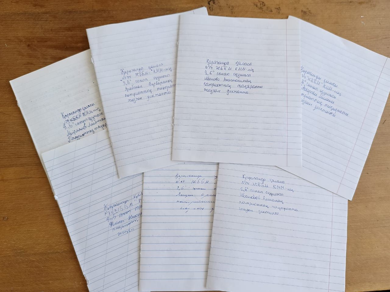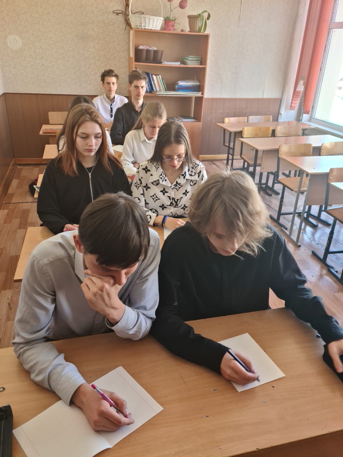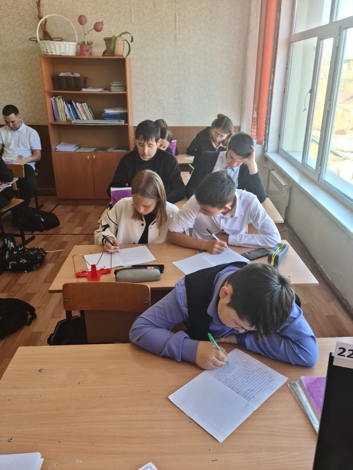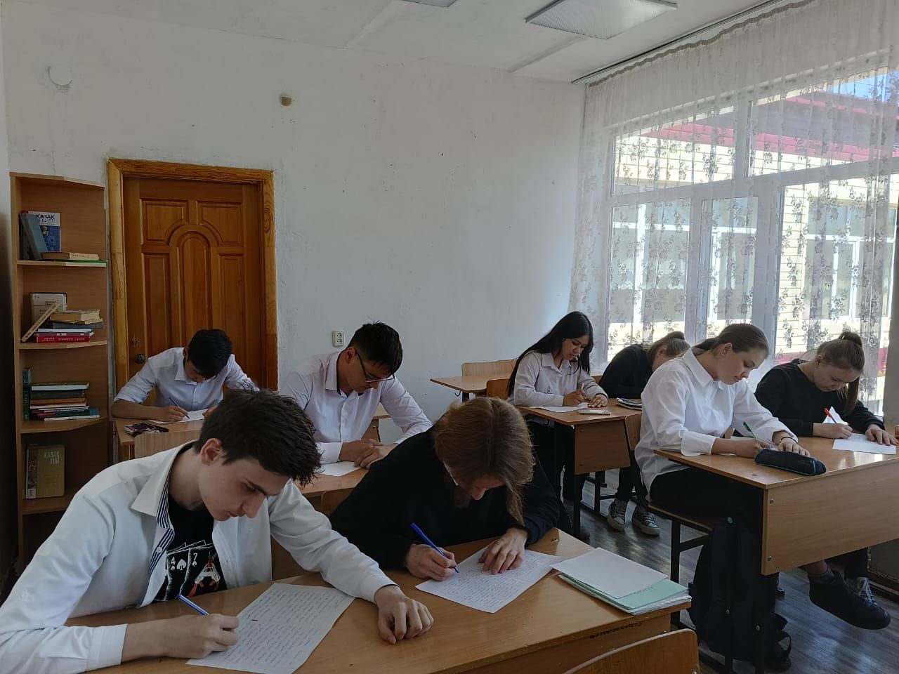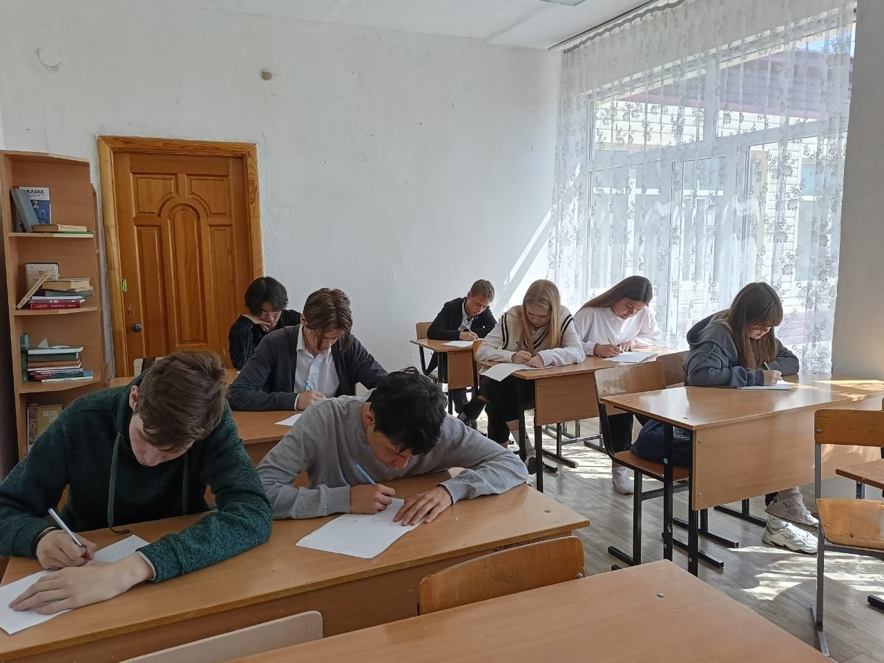 8-11 сыныптар жалпыұлттық патриоттық диктант жазу үстінде.