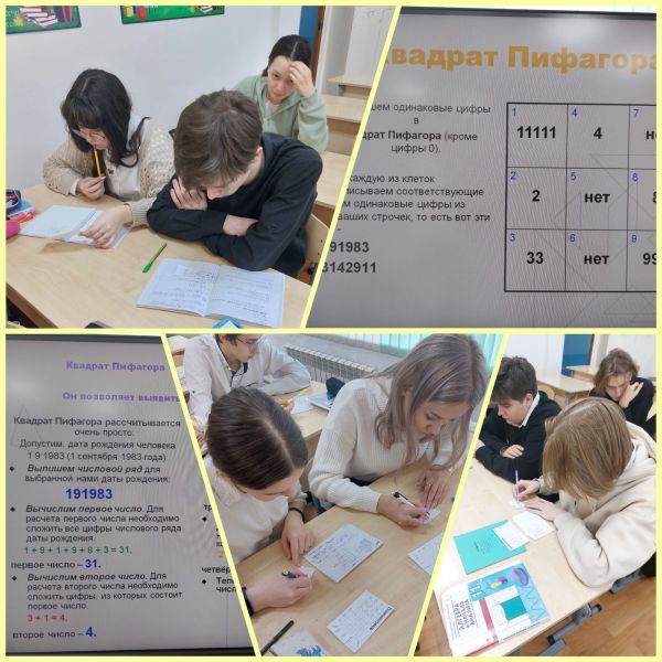 В рамках Недели математической грамотности "Математика вокруг нас" учащиеся 11 "Б" класса составляли квадрат Пифагора, чтобы узнать свои личностные характеристики с помощью древней науки нумерологии.