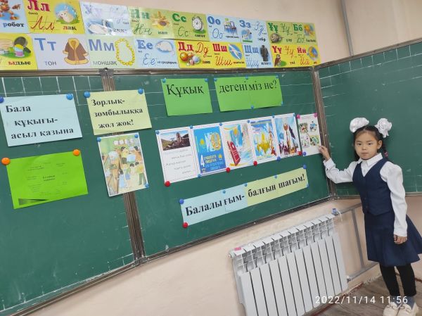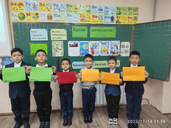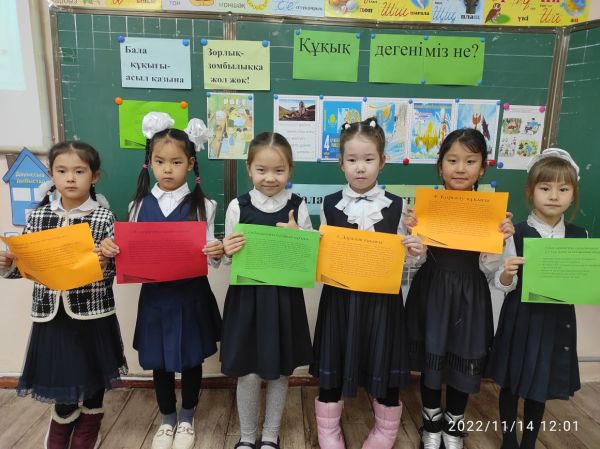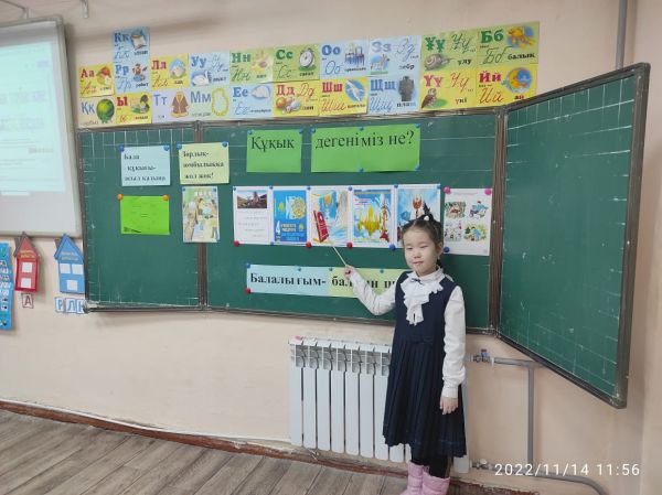 1"Б"сыныбында,«Құқық дегеніміз не?» тақырыбында сынып сағаты өтті.