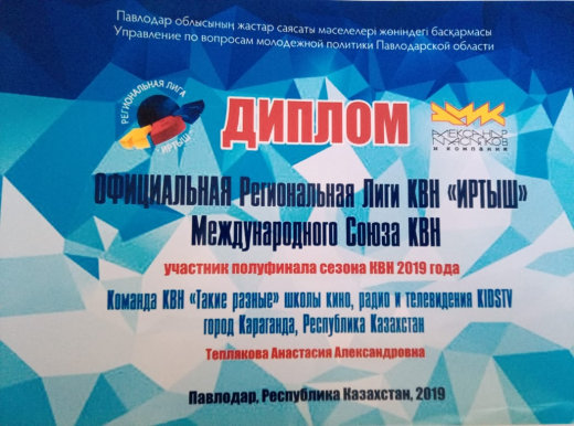 №82 ЖББОМ-тің 11 А сынып оқушысы Теплякова Анастасия «Әр түрліміз» командасының құрамында 2019 жылғы 20 қазанда Павлодар қаласында өткен Көңілділер мен тапқыштар клубының аймақтық лигасы…