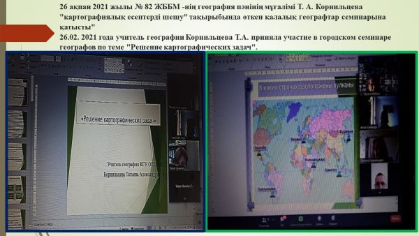 26 ақпан 2021 жылы № 82 ЖББМ -нің география пәнінің мұғалімі Т. А. Корнильцева "Картографиялық есептерді шешу" тақырыбында өткен қалалық географтар семинарына қатысты"