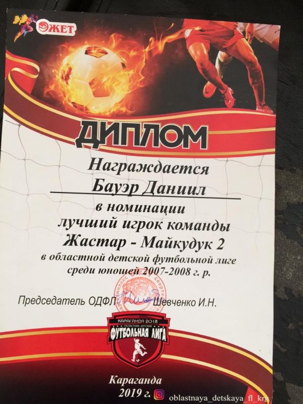 Ученик 5 В класса Бауэр Даниил награжден Дипломом І степени в номинации "Лучший игрок команды "Жастар-Майкудук 2", в областной детской футбольной лиге среди юношей 2007-20…