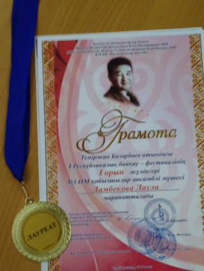 Ученица 8Ә класса, член ансамбля кобызистов, Ламбекова Лаула заняла I место в I Республиканском конкурсе – фестивале имени Темиржана Базарбаева.