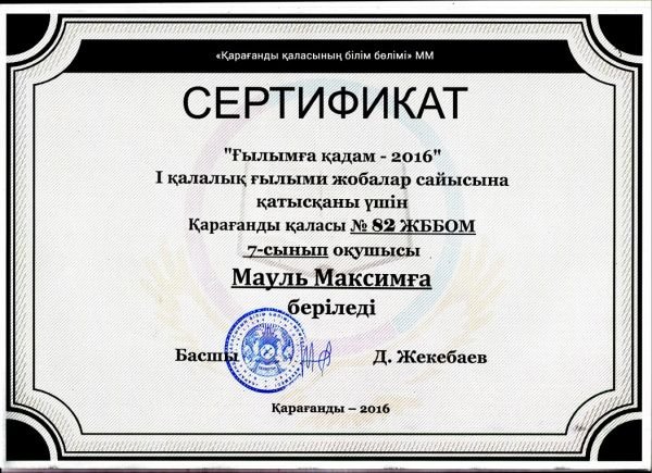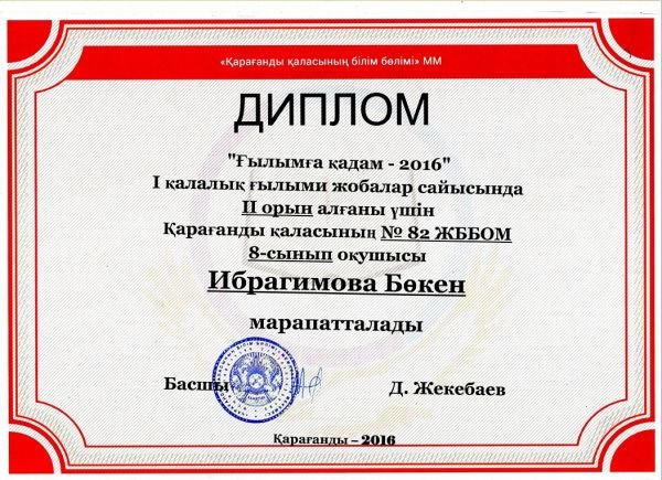 №82 ЖББО мектебінен "Ғылымға қадам-2016" І қалалық ғылыми жобалар сайысына 5 жоба ұсынылды. Екі ғылыми жоба ІІ орынға иеленді: 8 сынып оқушылары Букин Сержан,…