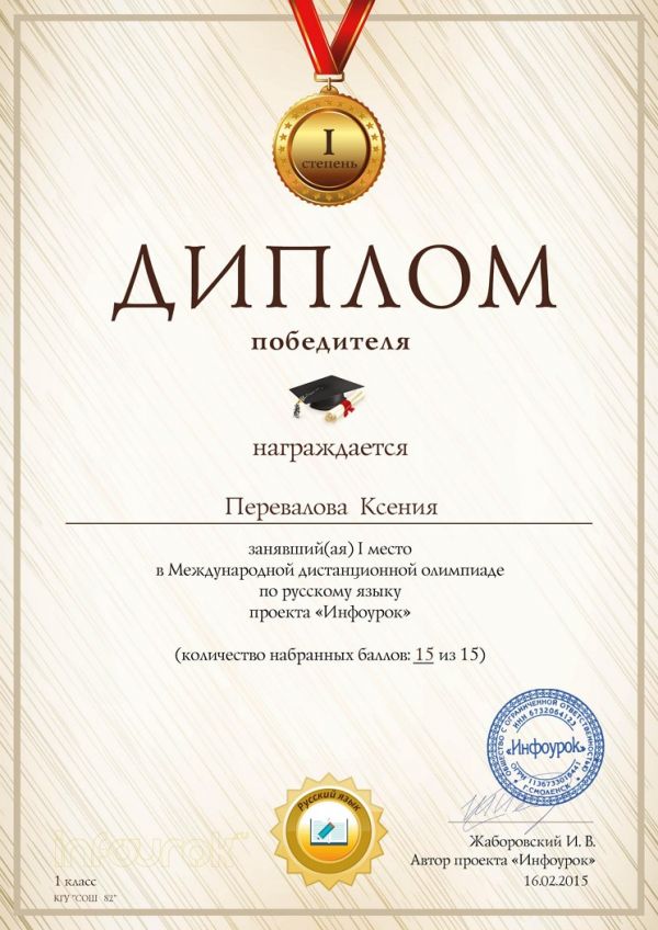 Поздравляем учащихся 1Б класса, занявших призовые места в Международной дистанционной олимпиаде по русскому языку проекта «Инфоурок».