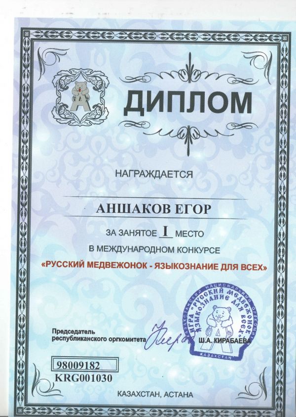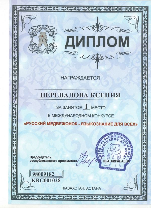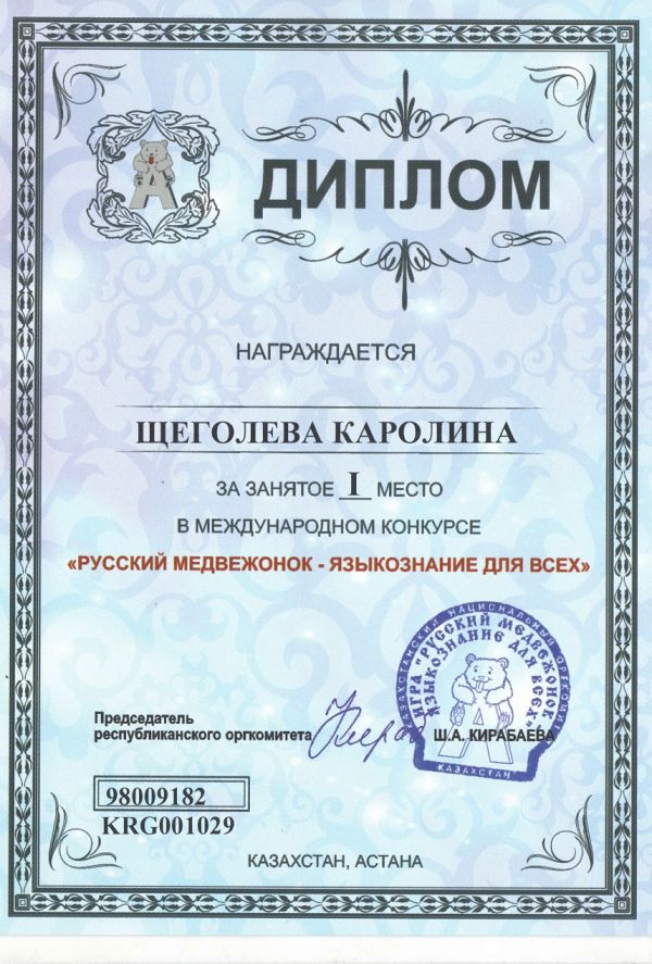 4 Б сынып оқушылары Аншаков Егор, Перевалова Ксения, Жуманбаев Даниль, Щеголева Каролина, Берш Арина, Григорьева Анастасия, Сәтбекова Әнелді Халықаралық «Русский медвежонок – тіл б…