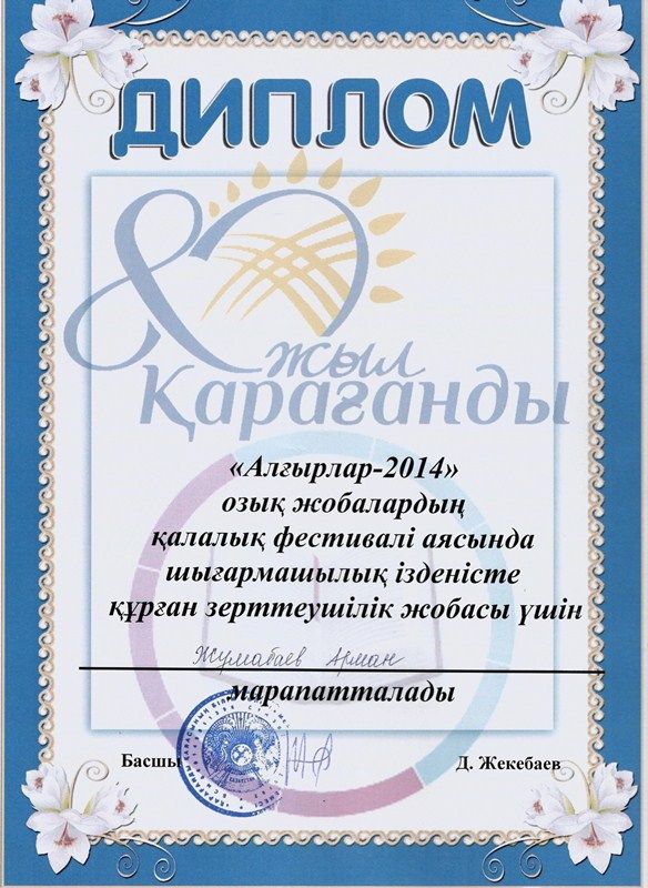 №82 ЖББОМ 9Ә сынып оқушылары Жанат Әлібек, Аринов Ерлан, Жұмабаев Арман және ғылыми жоба жетекшісі Какенбекова Анел Асылановна IV қалалық «Алғырлар – 2014» оқушылардың озық ж…