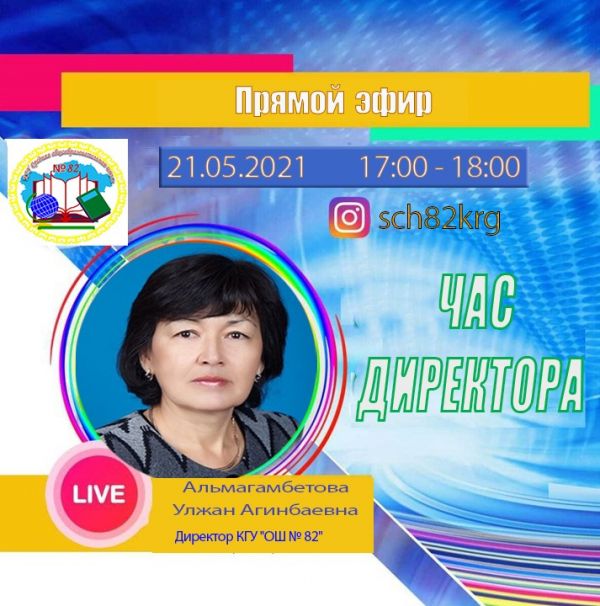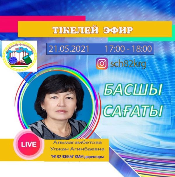 21.05.2021 жылы сағат 17.00-ден 18.00-ге дейін мектеп директоры Альмагамбетова Улжан Агинбаевна №82 ЖББМ-тің Instagram парақшасында тікелей эфирде «Ди…