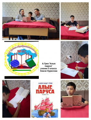 "БІР ОТБАСЫ – БІР КІТАП" акциясы аясында "ОҚЫРМАН ОТБАСЫ" облыстық байқауына қатысушы 5 "А" сынып оқушысы Хамзе Нурислам отбасымен түскен фотоколлажы.