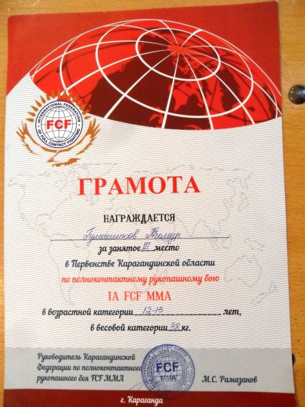Ученик 6 класса Гуменников Тимур по полноконтактному рукопашному бою в Первенстве Карагандинской области занял 3 место - бронзовую медаль.