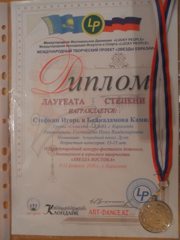 Стефкин Игорь, ученик 8 Б класса, стал лауреатом II степени в номинации Эстрадный вокал во II Международном конкурсе-фестивале детского, юношеского и взрослого творчества "Звезда востока"