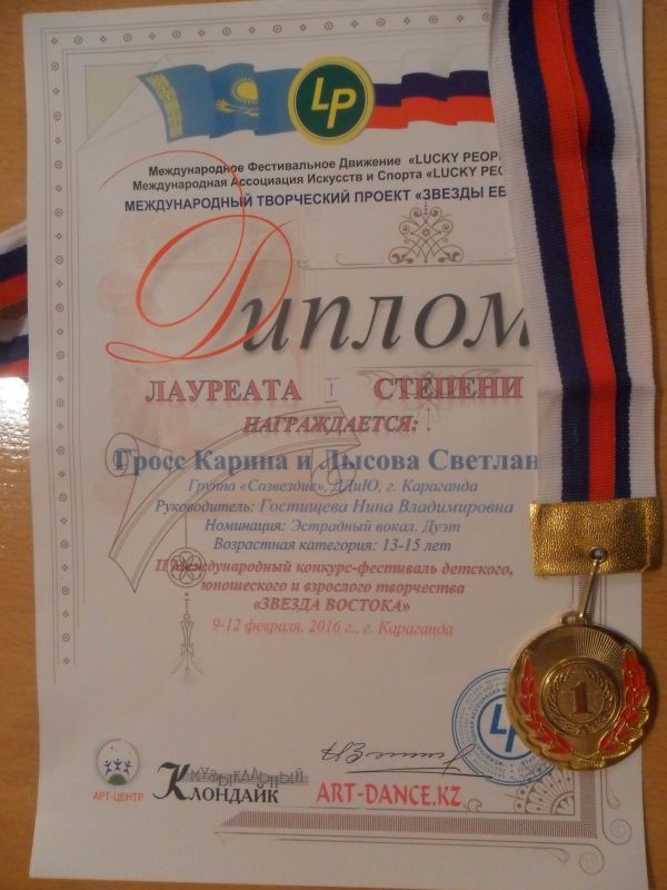 Гросс Карина, ученик 8 Б класса, стал лауреатом I степени в номинации Эстрадный вокал во II Международном конкурсе-фестивале детского, юношеского и взрослого творчества "Звезда востока"