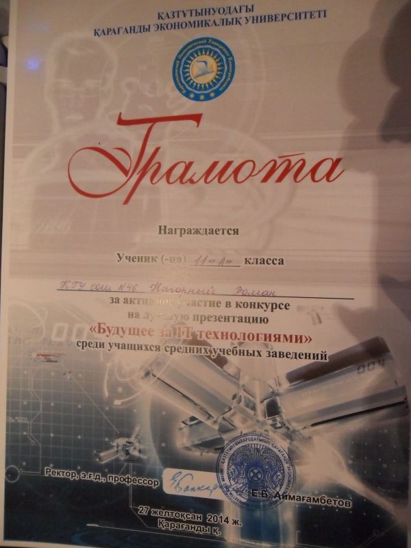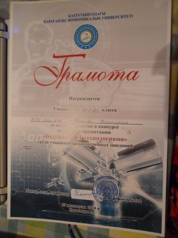 Поздравляем ученицу 11 А класса Исину Айзаду с занятым ПЕРВЫМ местом в областном конкурсе презентаций «Будущее за ИТ технологиями»