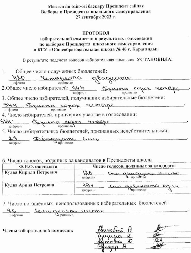 Мектептегі өзін-өзі басқару Президентін сайлау нәтижелері.Мектептің өзін-өзі басқару Президенті КУДВА АРИНА.