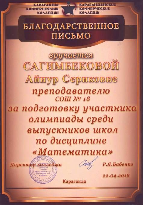 Қарағанды коммерциялық колледжінің ұйымдастырылуымен 9-сыныптар арасында өткен пәндер олимпиадасында мектебіміздің 9 «А» сынып оқушылары Тағабаева Ұлжалғас математика пәнінен 2 оры…