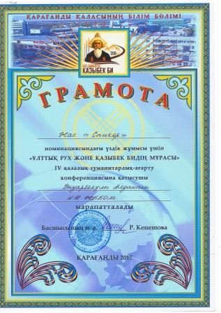 30.11.2017ж күні №102 мектеп-гимназиясында өткен «Ұлттық рух және Қазыбек бидің мұрасы» атты ІV қалалық гуманитарлық ағарту конференциясына қатысқан 10 сынып оқушысы Әнуарбекұлы Алданыш…