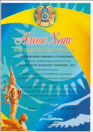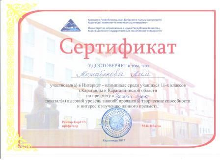 19.01.2017ж Қарағанды мемлекеттік техниқалық университетінде "Орыс тілі" пәнінен "Интернет-олимпиадаға" 11 сынып оқушылары Уалибекова Анеля және Кожабекова Асем қатысты. Ол…
