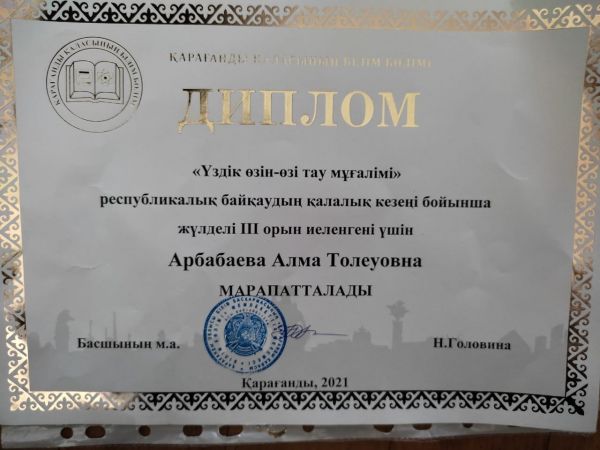 Биология және өзін өзі тану пәндері мұғалімі А. Т. Арбабаева Республикалық байқаудың қалалық кезеңі бойынша жүлделі ІІІ орын иеленгені үшін марапатталады