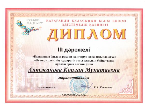 Мектебіміздің технология пәні мұғалімдері «Әсемдік әлемінің құдыреті» қалалық байқауына белсене қатысып жүлделі орындар иеленді.Айтжанова Қорлан Мукатаевна жүлделі 3-орын, Тулегено…