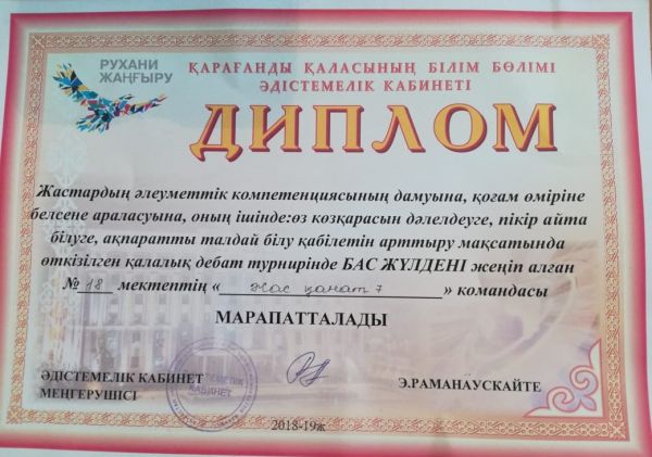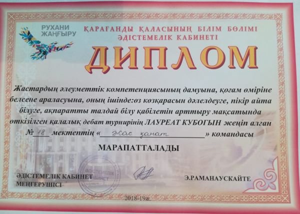 Мектебіміздің «Жас қанат» дебат командасы қалалық дебат турнирінде «Бас жүлдені» және Лауреат кубогын жеңіп алды.Құттықтаймыз!!!