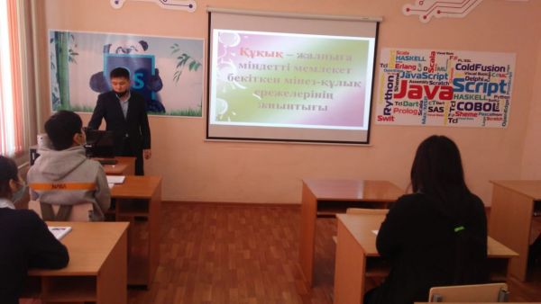 10.02.2021 жылы Құқықтық сауаттылық апталығы аясында 8 сыныптарға сынып жетекшісі Айдана Болатқызының ұйымдастыруымен "Жасөспірім және заң" тақырыбында сынып сағаты өткізілді.