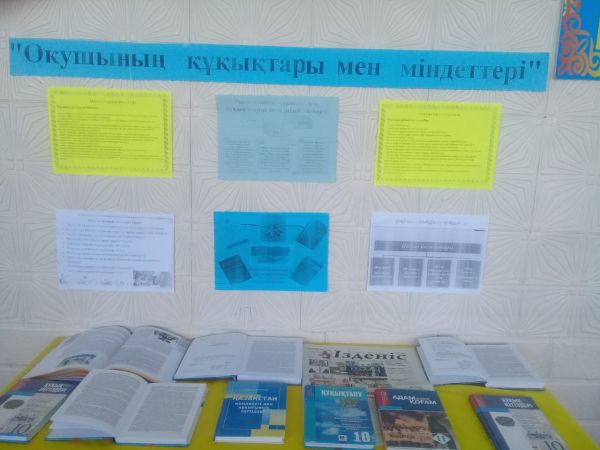 Құқықтық сауаттылық апталығы аясында,мектеп кітапханасында "Оқушының құқықтары мен міндеттері "тақырыбында көрме ұйымдастырылды. Мақсаты:Заңға деген құрметті тәрбиелеу,құқықтық сауаттылықт…