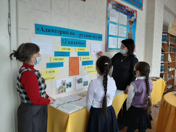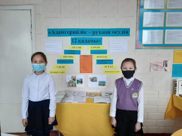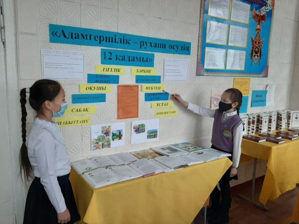 №18 жалпы білім беретін мектептің кітапханасында "Адамгершілік рухани өсудің 12 - қадамы" тақырыбында 4 сынып жетекшісі Ж.А.Ахметовамен мектеп кітапханашысының  ұйымдастыруымен көрме…
